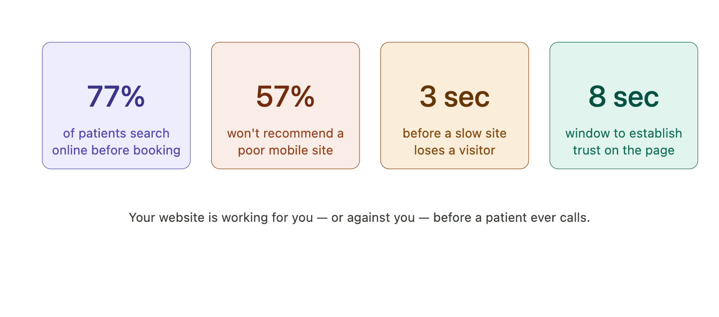 "Patients make trust decisions before they read a single word. Layout, load speed, and design quality signal whether a practice is worth their time."